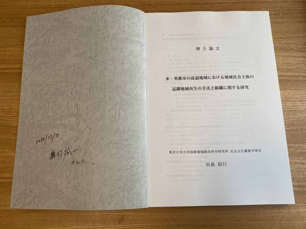 今年度は多くの大学でオンラインでの講義をさせていただきましたが、やっぱり、対面がいいですね。ゼミでの指導を通じて、楽しい時間を過ごさせていただくと同時に、みなさんから元気をもらいました。お声がけいただいた田島先生には、このような機会をいただき、改めて、感謝を申し上げます。また、田島先生の都市再生に関する博士論文を拝受しましたので、しっかりと勉強をさせていただきます。サインをいただくと嬉しいですね。サインをいただくのは、東大の加藤耕一先生から私のバイブルである「時がつくる建築」にサインをいただいた以来です。また、今後の活動についても、お話させていただきました。これから、いろいろなことを田島先生とご一緒できれば嬉しいです。