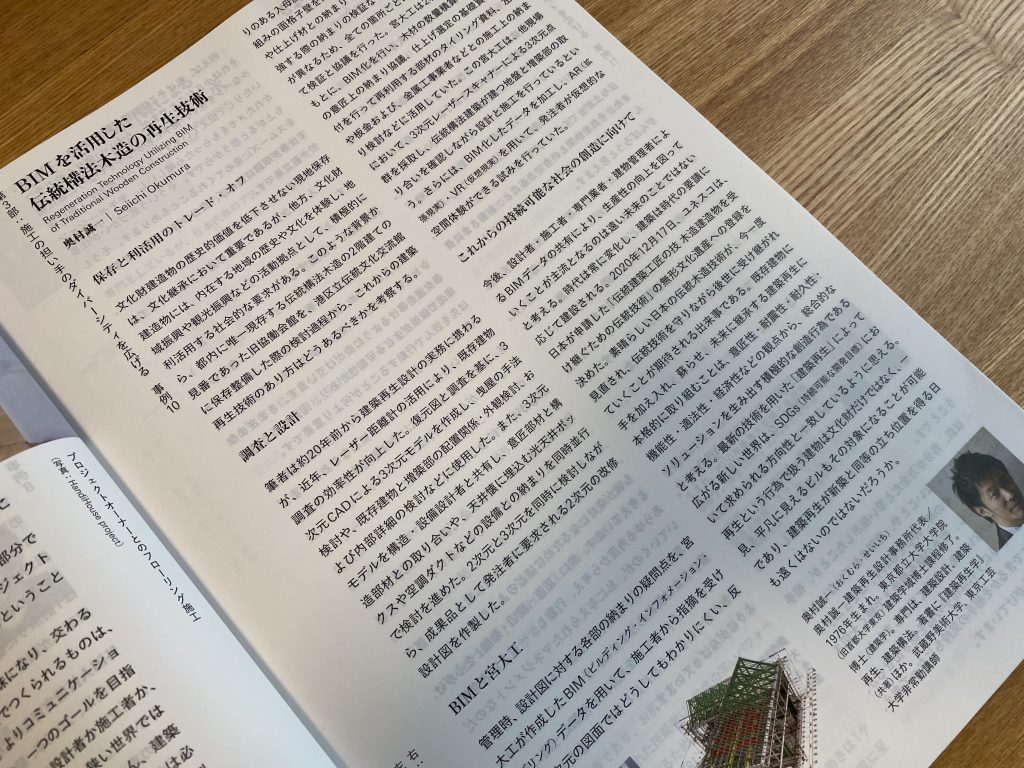 早稲田大学の石田航星先生にお声がけいただきました、日本建築学会が発行する「建築雑誌」という建築の専門誌2021年6月号の「建築生産をアップデートする」という特集号に、「BIMを活用した伝統構法木造の再生技術」と題し、寄稿した論考が掲載されました。建築生産とは、建築のつくり方のことで、企画・設計・施工・維持管理を含む、建築の生産システムを意味します。その中でも、私は、宮大工さんが持つ伝統構法木造における再生技術に焦点をあてて論考しました。